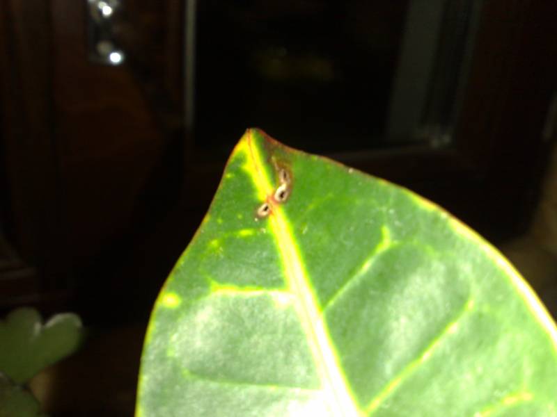 Здравствуйте! Вчера обнаружила на своем кротончике на одном только листике....Подскажите пожалуйста что это такое? Цветочек стоит на западном окошке, растет хорошо.