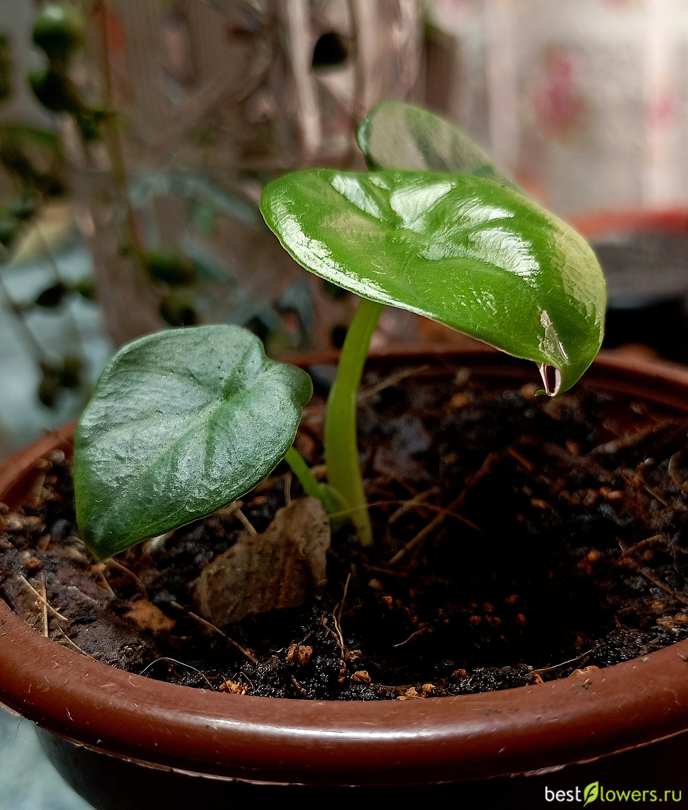 Всегда хотелось иметь дома алоказию (но не такую, а Полли или похожую). И вот пару недель назад подвернулась возможность, коллега подогнала малюсенькую почти 2-х сантиметровую деточку крупнокорневищной. За это время растюша стремительно так подросла, даже выпустила пару листиков