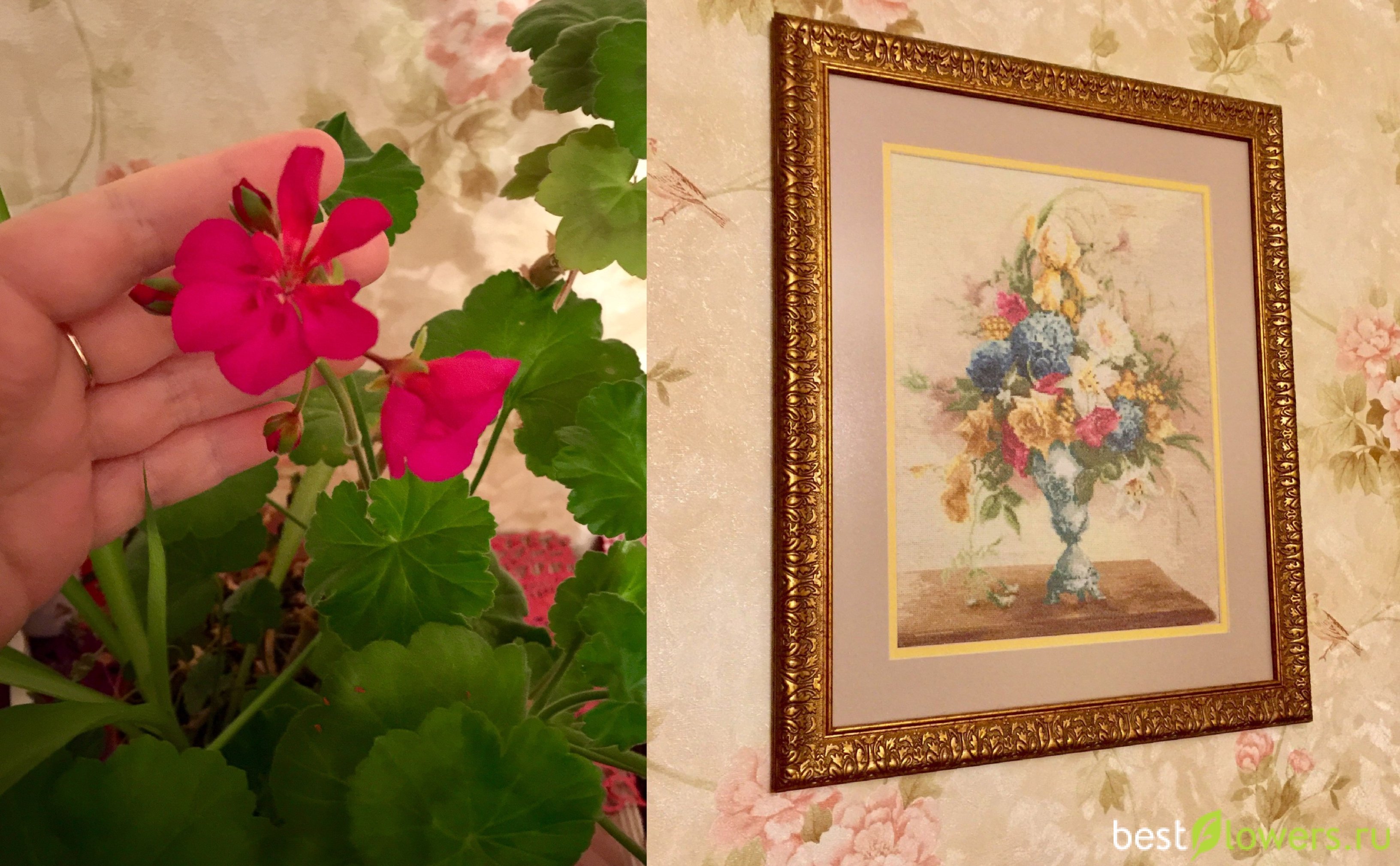 В гостиной зацвела герань. Это мило. Почему-то капризничают у меня герани. Так же в горшке кисличка и детка хлорофитума. Кстати, в гостиной обои у меня с цветочным рисунком и вышитый крестом натюрморт, на картине пусть и срезанные, а все же цветы.