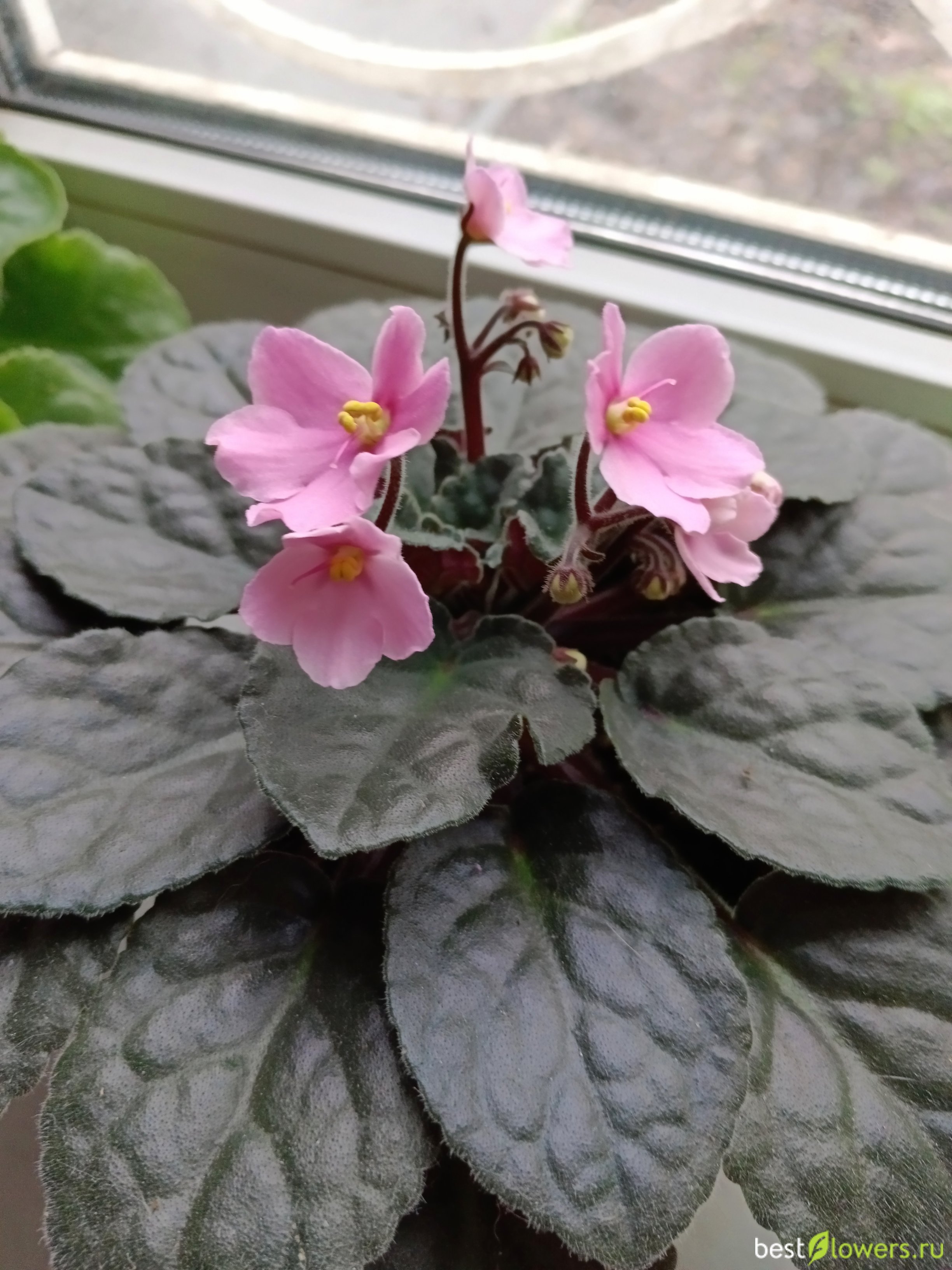 Фиалка розовая, пять лепестков и жёлтая серединка. Бутоны белые, цветы раскрываются бледно-розовыми, затем цвет становится более насыщенный.