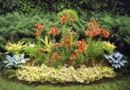 Клумба универсальна по ландшафтному образу и украсит любой ландшафт на солнце или в полутени. Клумба рассчитана на осмотр с трёх или четырёх сторон. На фото клумба с осмотром фронтально, слева и справа. Размер 1,5м х 3м. По форме клумба может быть исполнена как овал, прямоугольник или симметричная капля. Цветение весь сезон с мая по октябрь В композицию клумбы включён низкорослые кустарники - барбарис Тунберга жёлтоокрашенный и бересклет Форчуна. На заднем плане - кулиса из можжевельника. Уход простой.Луков