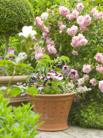 gpbo05-00006011-001-fb~terracotta-container-of-summer-plants-in-a-rose-garden-little-malvern-court-worcester-posters