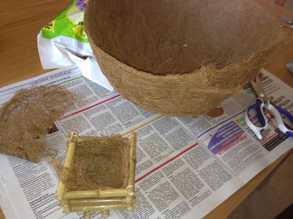 купила в магазине кокосовую штучку, не знаю как ее обозвать. разрезала ее и запихала, чтобы при поливе почва через щели не выпадала