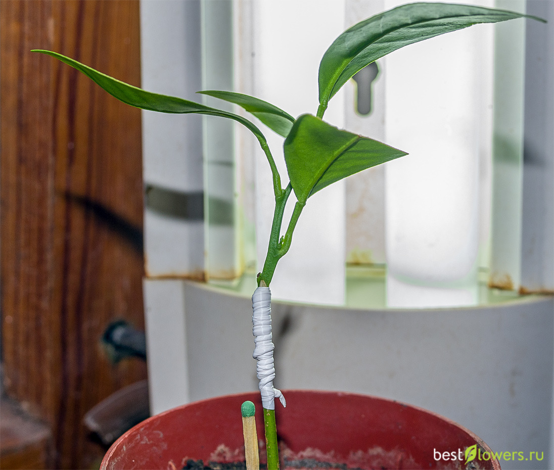 Первая попытка прививки в расщеп каламондина на 6-и месячный сеянец лимона. 18 дней, пока "полёт нормальный" :)