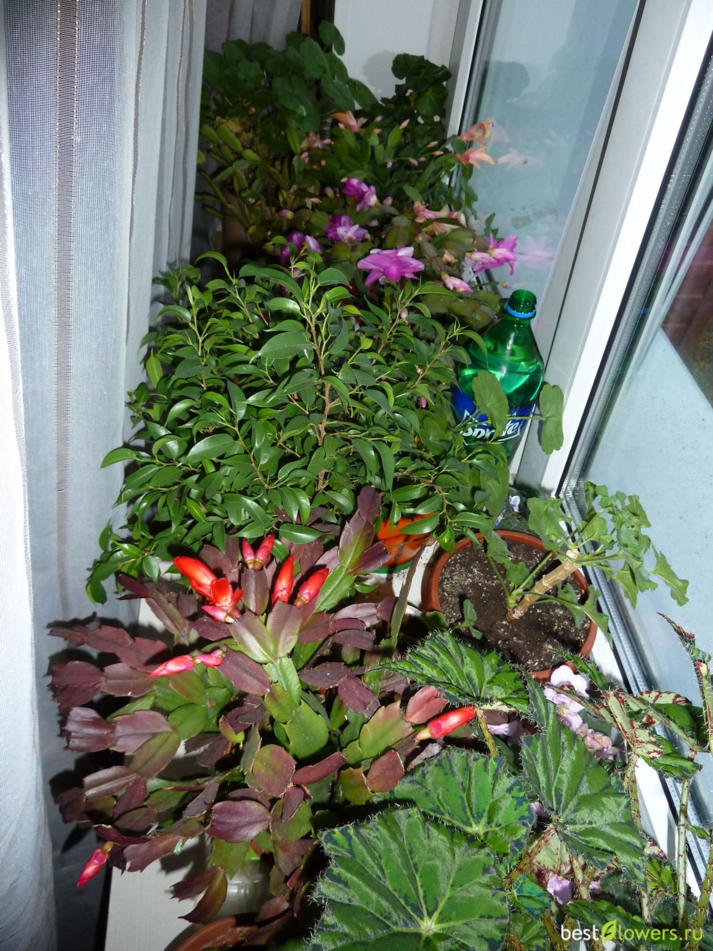 13 ноября 2015. Начинает зацветать красная шлюмбергера. Растения стоят плотно, в два ряда. Тесновато однако))