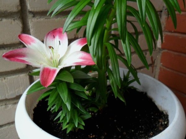 Азиатская низкорослая лилия Лоллипоп (Lilium Lollypop), встречающаяся в коллекциях и под названием Holebibi (Холебиби). Идеальна для посадки в горшки и контейнеры. Цветок широкочашевидный, вверхсмотрящий, желтовато-белый с малиново-розовыми кончиками лепестков. Крап мелкий единичный. Тычиночные нити светлые, пыльники оранжево-коричневые. Высота этой лилии - 17 см. Диаметр единственного цветка на ней – 13 см.