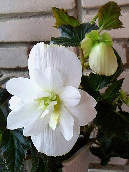 Кустовая клубневая бегония Махровая Белая (Begonia Double White). Это крупноцветковый сорт. Махровые цветки, в соответствии с названием, имеют белую окраску
