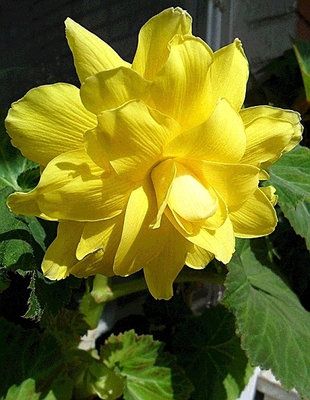 Кустовая клубневая бегония Махровая Желтая (Begonia Double Yellow). Это крупноцветковый сорт, махровые цветки, в соответствии с названием, имеют желтую окраску. Диаметр цветка моей бегонии – 12 см. Высота бегоний этого сорта 20–30 см. Цветет обильно и непрерывно в течение всего сезона до заморозков.
