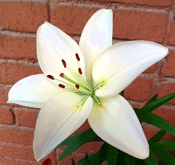Цветок азиатской низкорослой лилии Нью Вейв (Lilium New Wave). Эта лилия идеально подходит для выращивания на балконе в больших горшках. Ее высота – 52 см. Диаметр белоснежного цветка – 18 см.