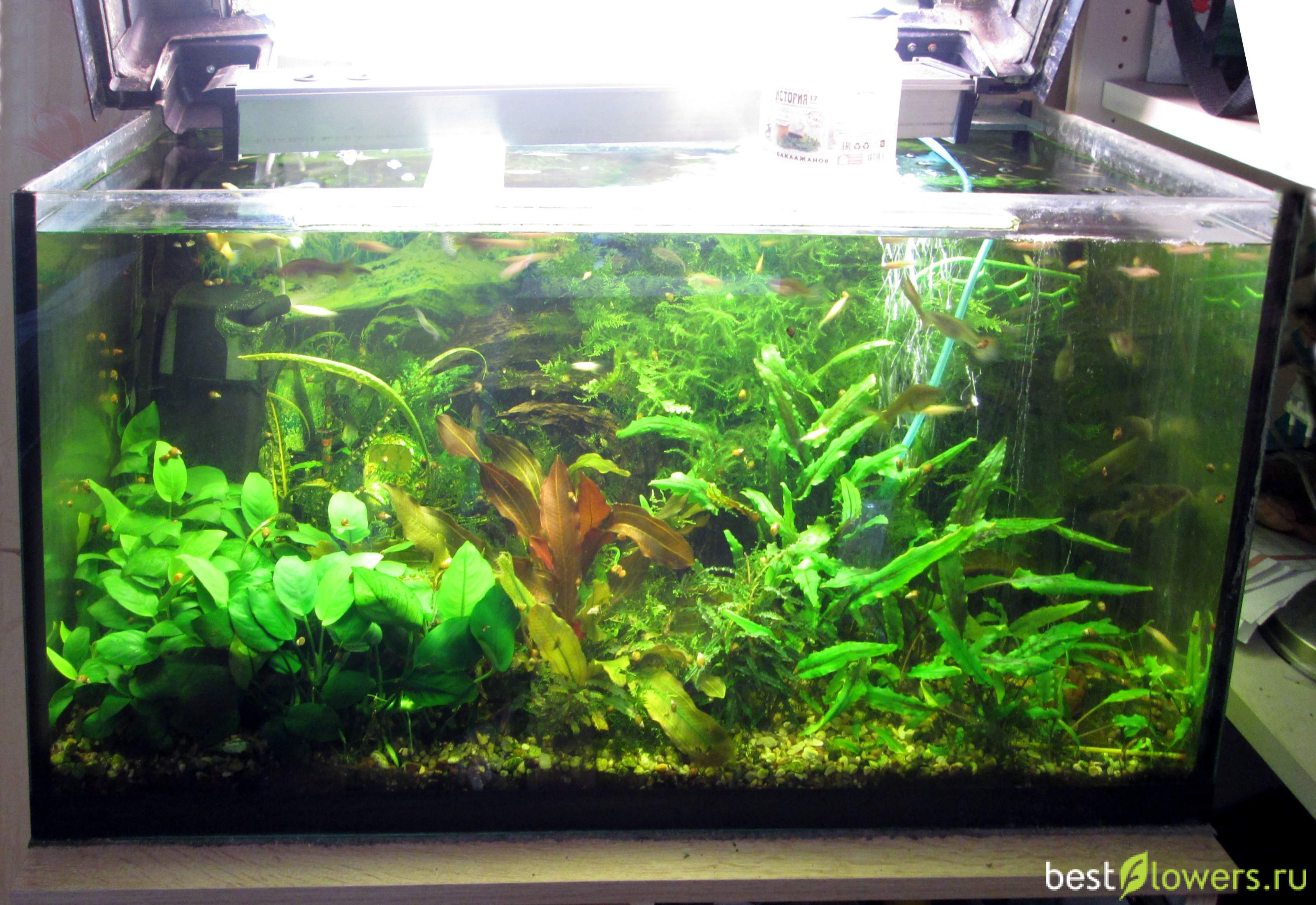 Слева направо: Анубиас Нана, Криптокорина Тонкинская, Мох Феникс, Эхинодорус Магрибинец (или Синусоид), на переднем плане Буцефаландры, на заднем - Мох Яванский, Криптокорина Лютея