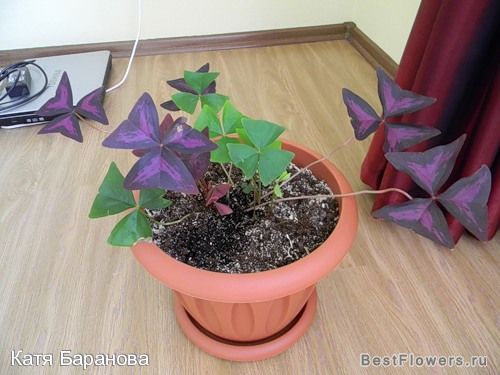 Кислица. Все старые листочки высохли после пересадки, но быстро новенькие лезут. В горшке разные цвета.