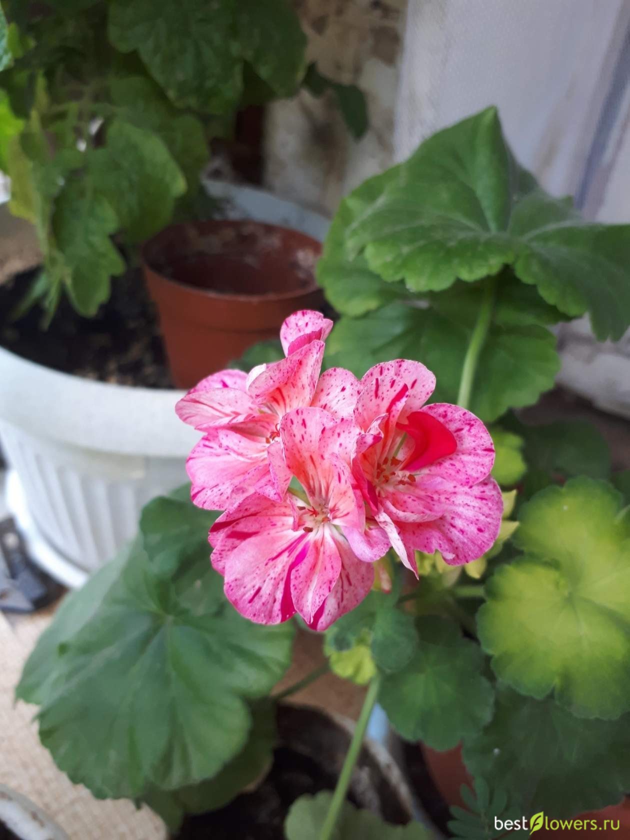 Большие цветы махровой пеларгонии усыпаны вишневым крапом. Очень интересный сорт
