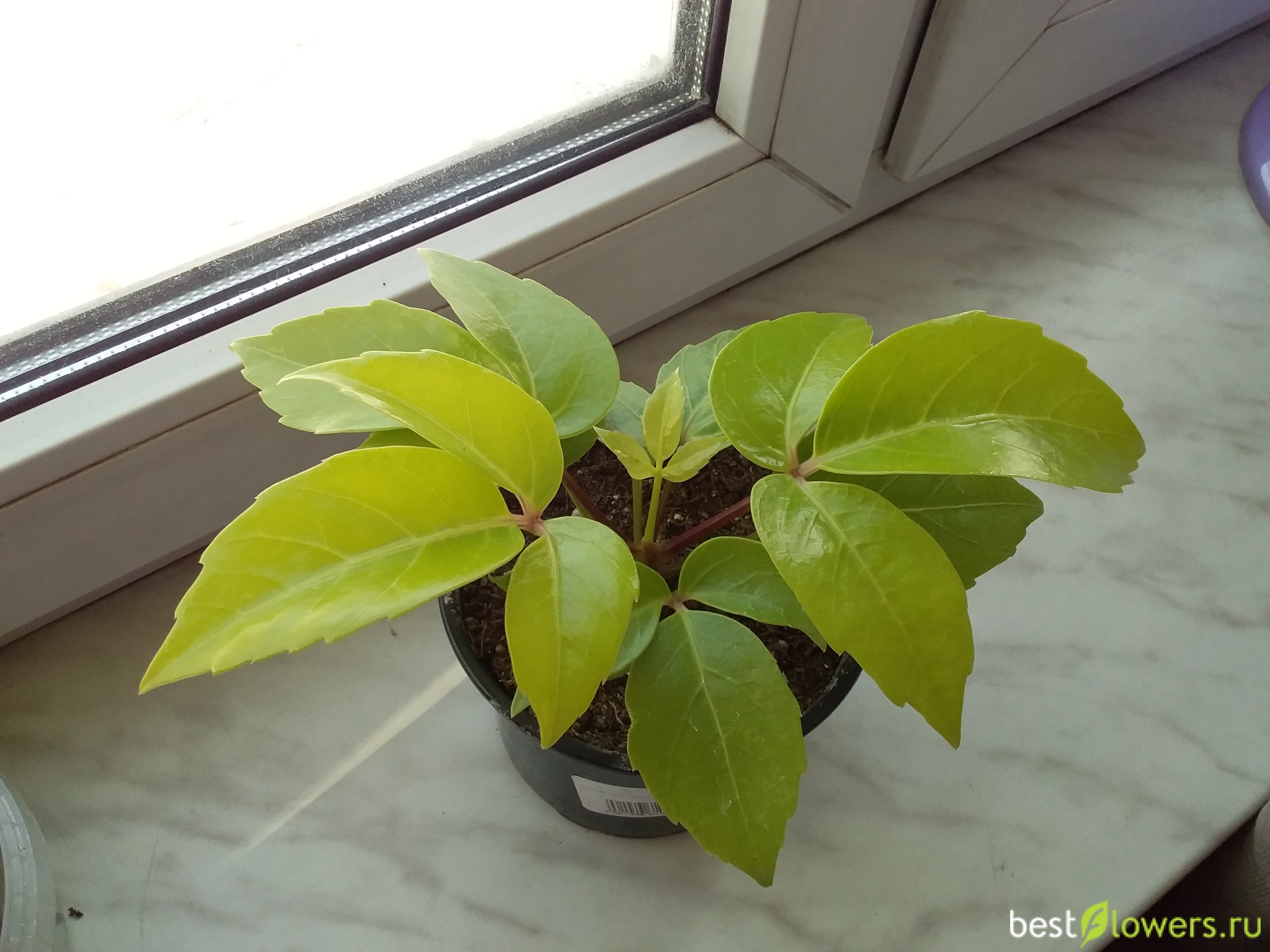 На этикетке горшка написано Шеффлера древовидная. Цвет светло-зеленый или даже желто-зеленый. Листик тройной.