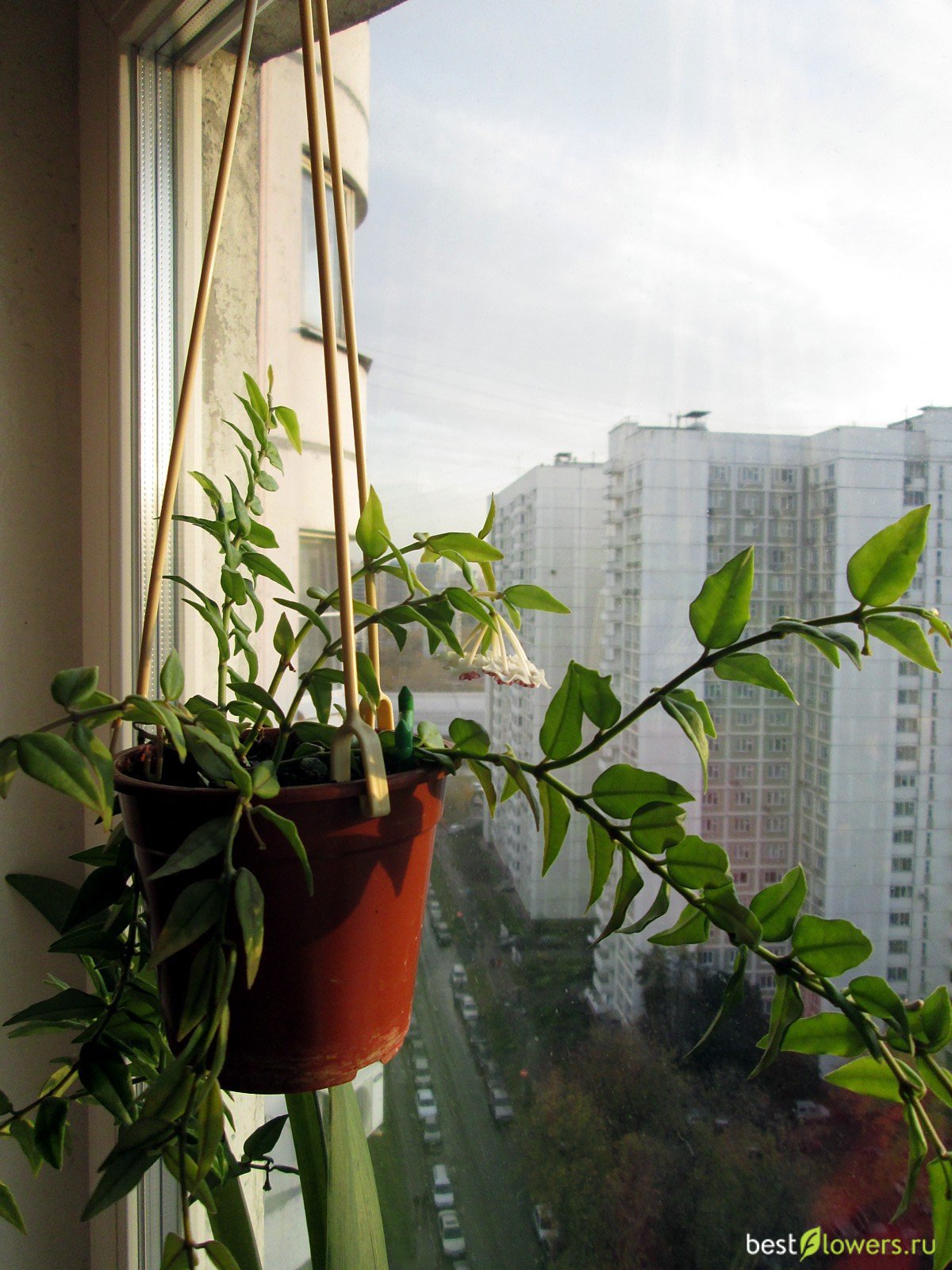 Вися на Юго-западном окне, поливаемая 1-2 раза в неделю (вода вытекает за 20-30 секунд) цветёт не переставая всё лето и почти полосени.